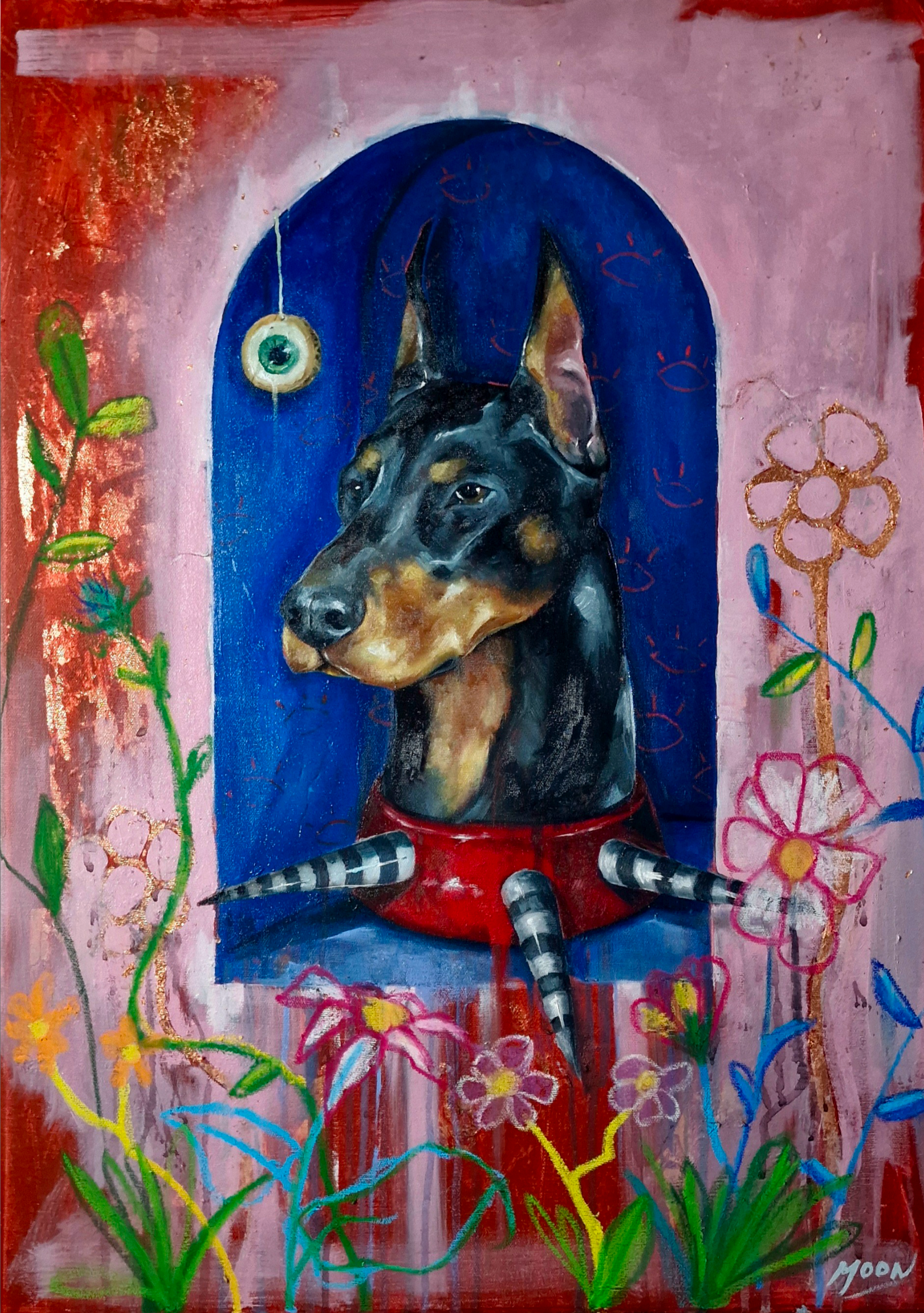 Oil, acrylic, oil pastel, and copper leaf on canvas